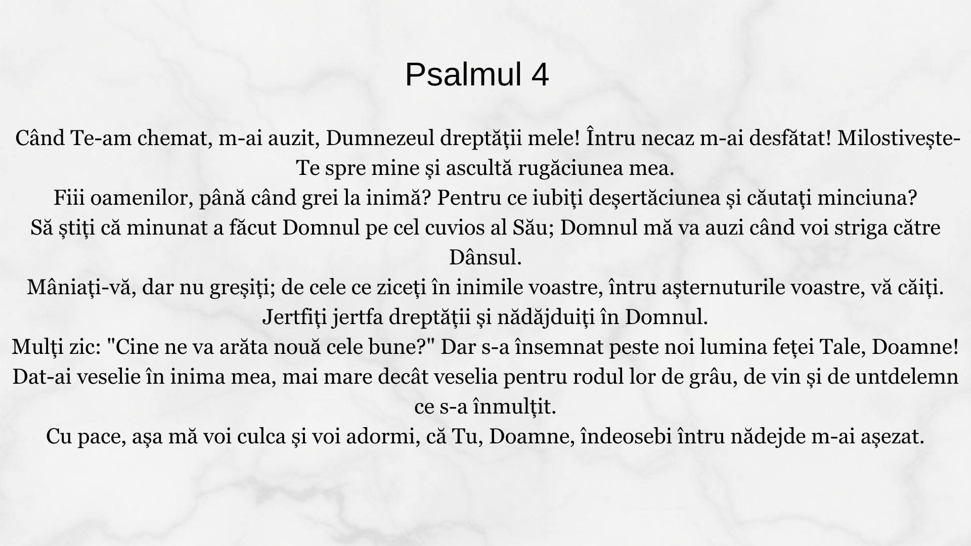 Cu pace, aşa mă voi culca şi voi adormi, că Tu, Doamne, îndeosebi întru nădejde m-ai aşezat.